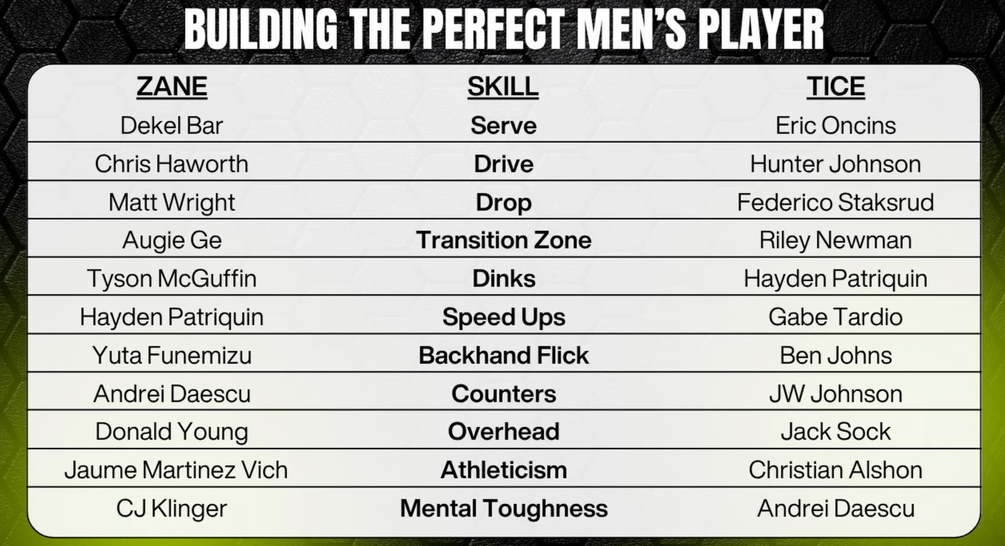 Erik devised the parameters: they would go back and forth, choosing one player each for the 11 essential skills required to be a top PPA men's pro.