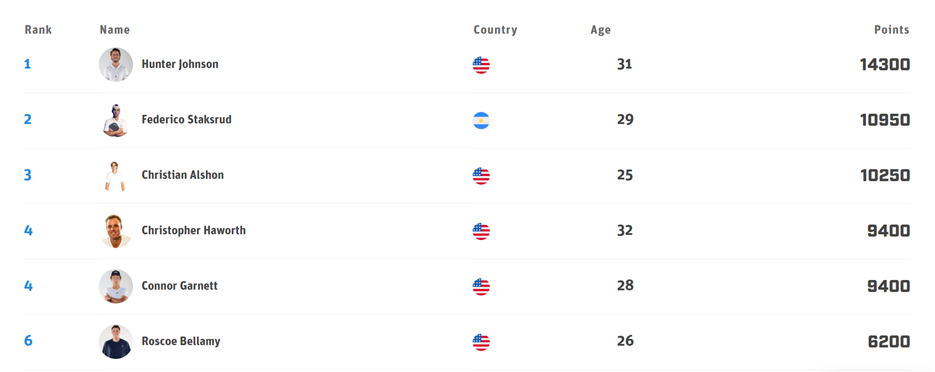 A look at the current top 6 ranked singles players, courtesy of the PPA TourWhat made this gold run even more impressive was the fact that just a week ago, Hunter had to retire in the second game of his bronze medal match at The Masters against Roscoe Bellamy. I called that match and Hunter was in obvious pain and hobbling on his right knee. To bounce back one week later and win the Indoor Championships is nothing short of miraculous.