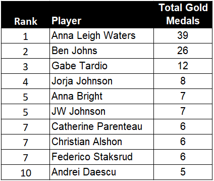 One note - I am treating all events equally, meaning a singles gold is worth just as much as a doubles gold.