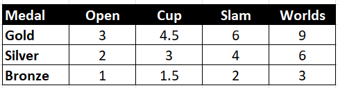 This is where the calculation comes in. I am using a simple 3-2-1 method. A Gold Medal is worth 3 points, a Silver is worth 2 and a Bronze is worth 1. Additionally, since the PPA Tour makes Cups, Slams, and Worlds more important than Opens, I have built those calculations in as well.