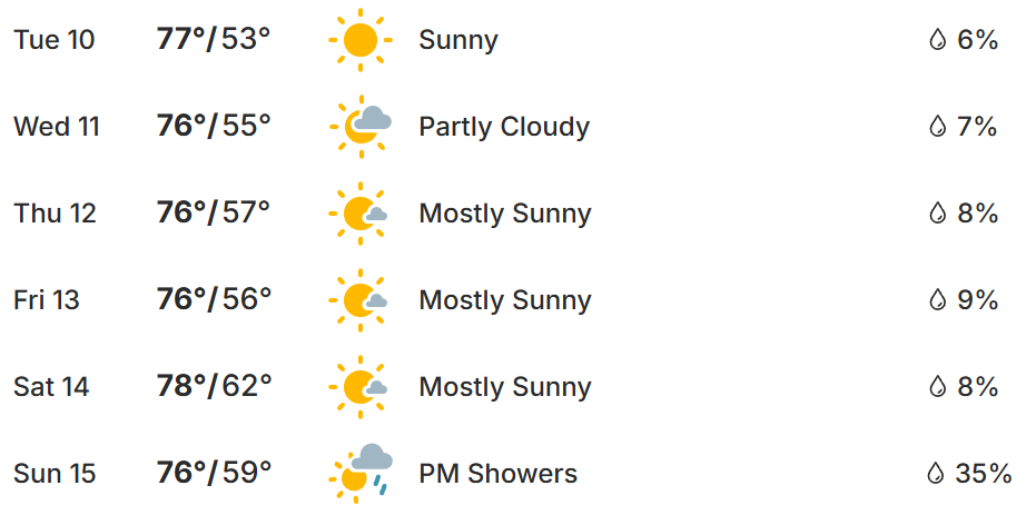 Obviously it is a little early to be predicting rain on Championship Sunday. However, that does seem like a real possibility. Temperatures will be in the mid to upper 70s, with lows in the 50s, throughout the week.